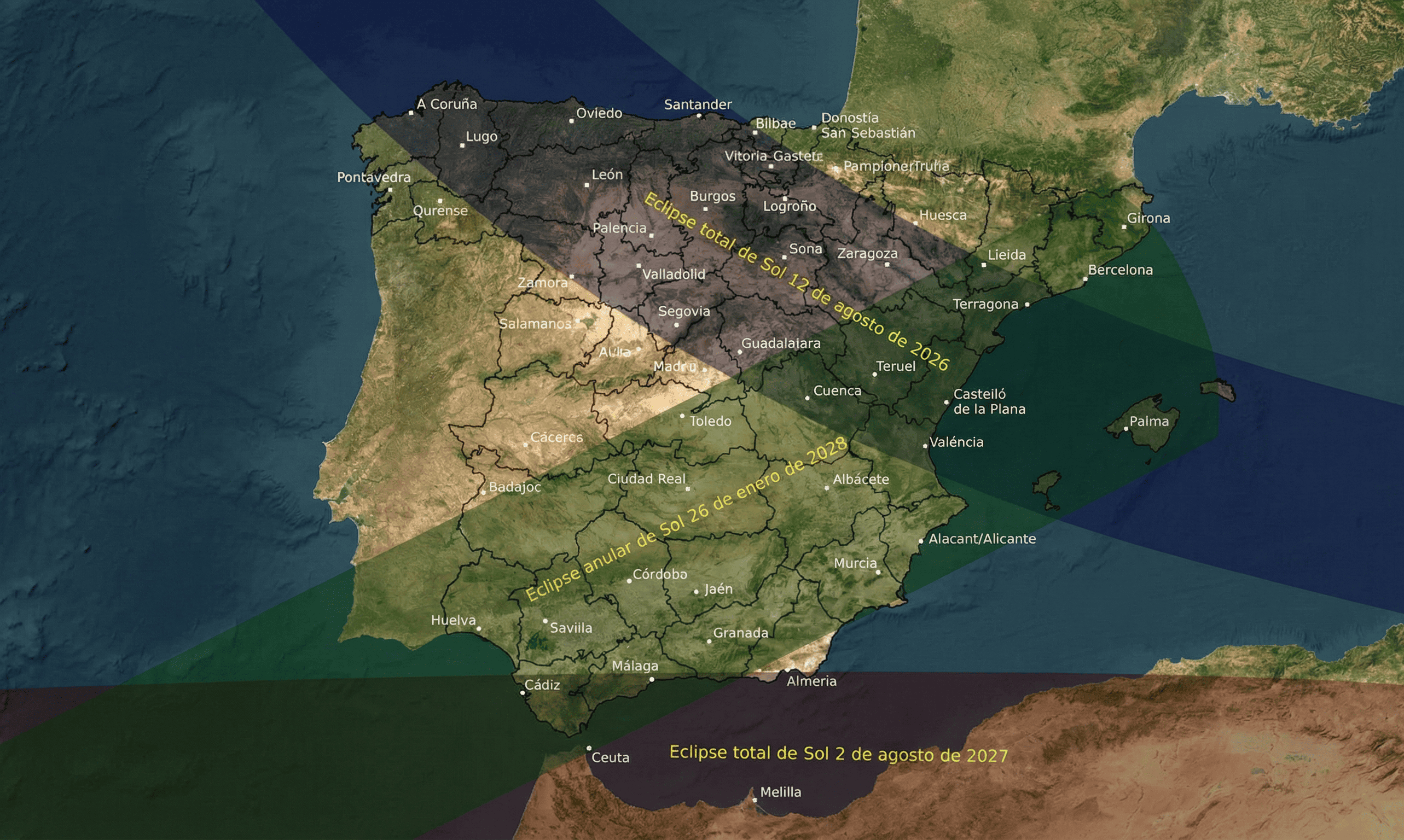Descubre las mejores ciudades de España para ver el eclipse, mapas de la franja de totalidad y la duración exacta de la oscuridad en cada provincia.
